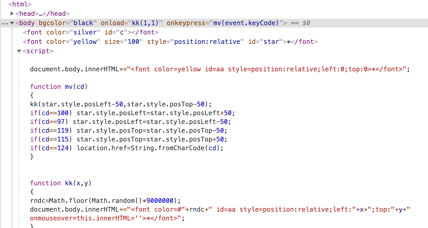 소스코드를 분석해보면 a,s,d,w 그리고 | 를 누르면 이벤트가 발생하는 것을 알 수 있다.