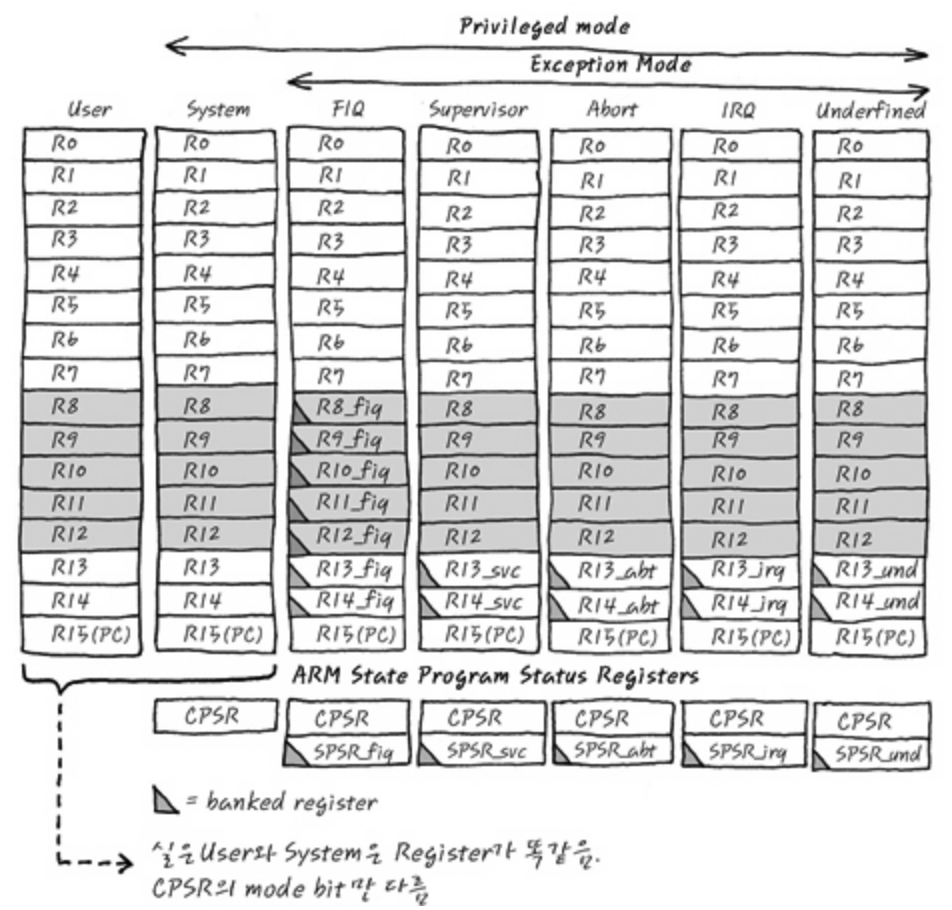출처 : https://www.cs.fsu.edu/~hawkes/cda3101lects/chap3/F3.13.html ARM core register in ARM state (x32, x64:요즘 핸드폰)