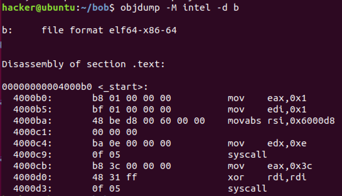nasm -felf64 hello.asm; ld -o hello hello.o