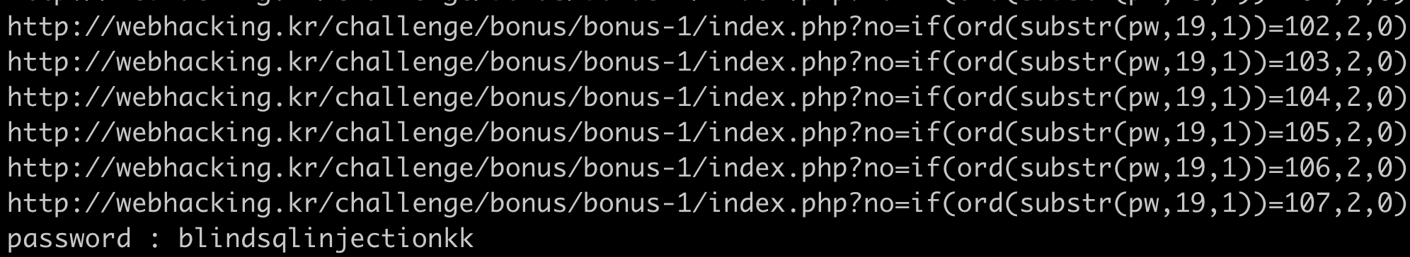 그리하여 admin 의 Password 는 blindsqlinjectionkk 이다.